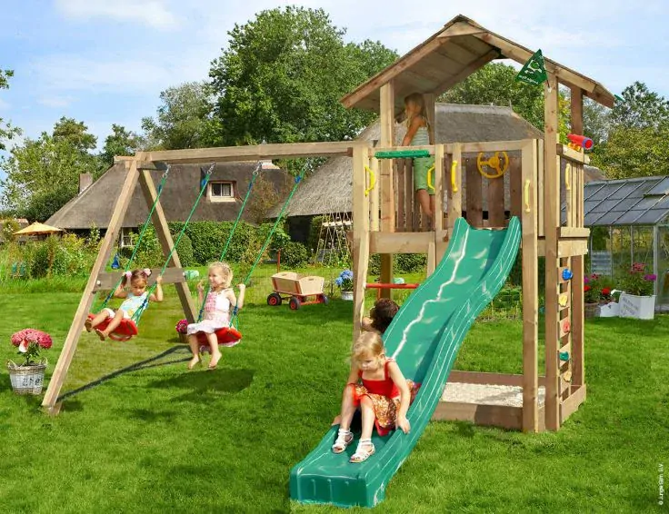 Súčasťou balenia je rezivo(drevo) + krabica(montážne prvky a doplnky) + šmýkačka 2,65m(možnosť výberu z farieb-modrá,zelená,červená,žltá,jablkovozelená,bledomodrá).
